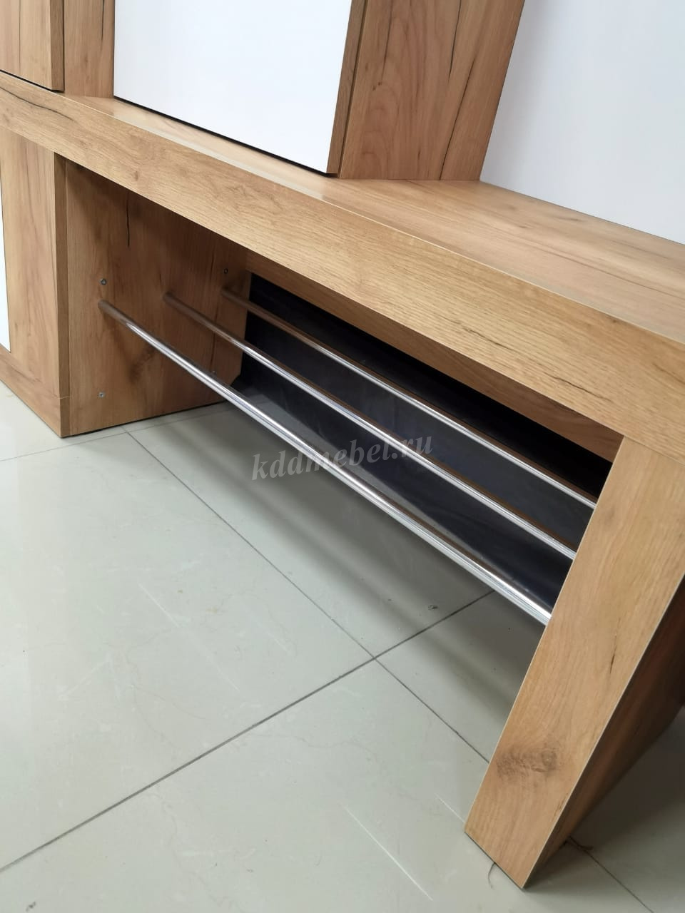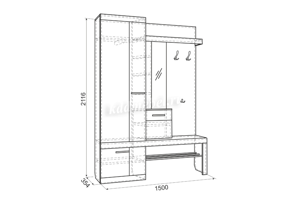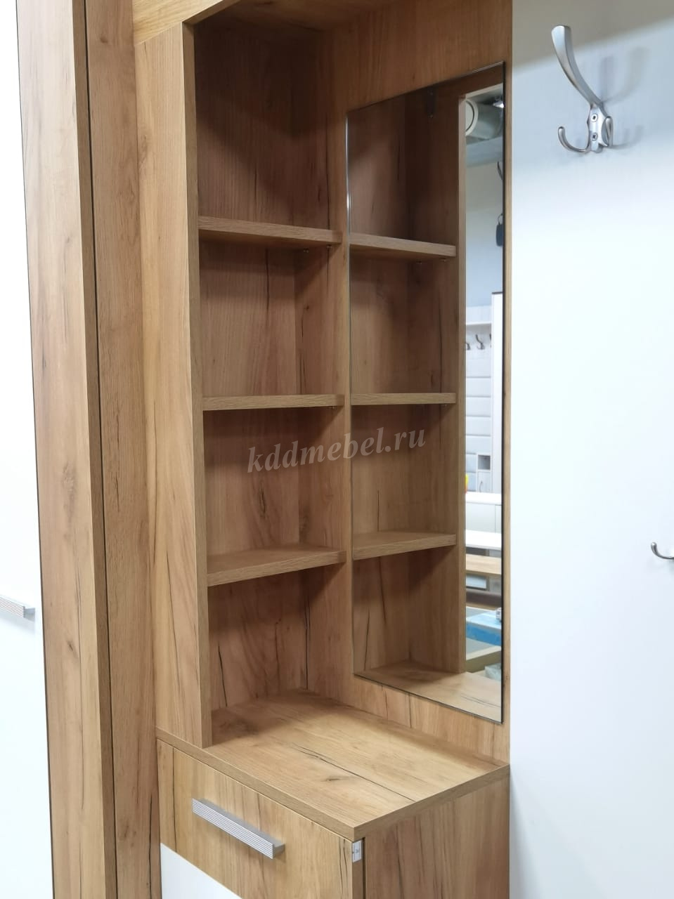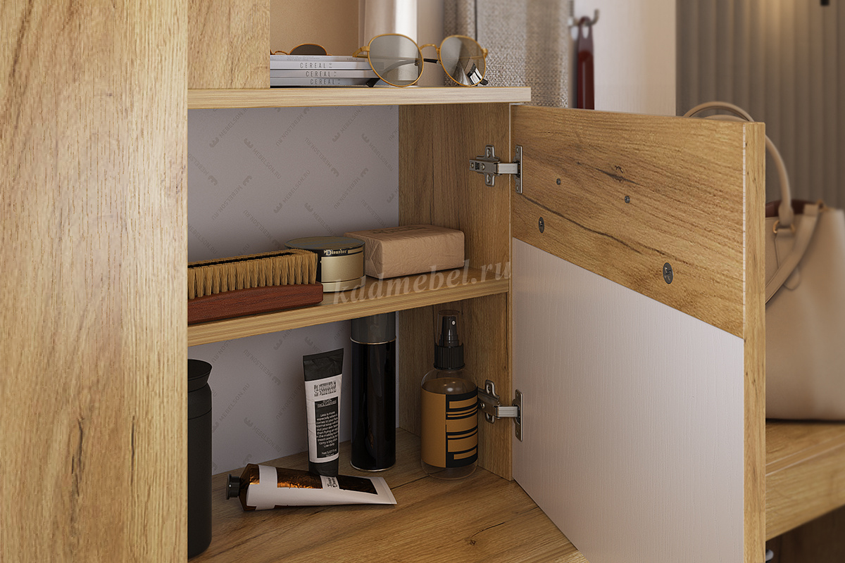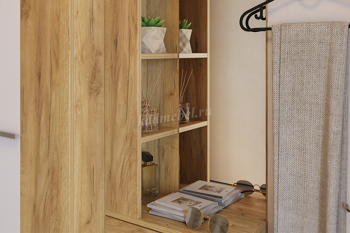 «Алекс»- прихожая 3 в 1. Это открытые ниши для размещения одежды, сумок на металлические крючки и модное решение из хромированных трубок для хранения повседневной обуви. Закрытый шкаф-гардероб для несезонной обуви и верхней одежды на плечиках. А так же ниша-трюмо с зеркалом и полками сбоку станут незаменимыми помощниками в наведении утреннего марафета. В закрытом шкафу под зеркалом можно хранить средства для чистки обуви, фен и другие нужные вещи. Прихожая «Алекс»- в ней поместится ВСЕ и даже Больше!