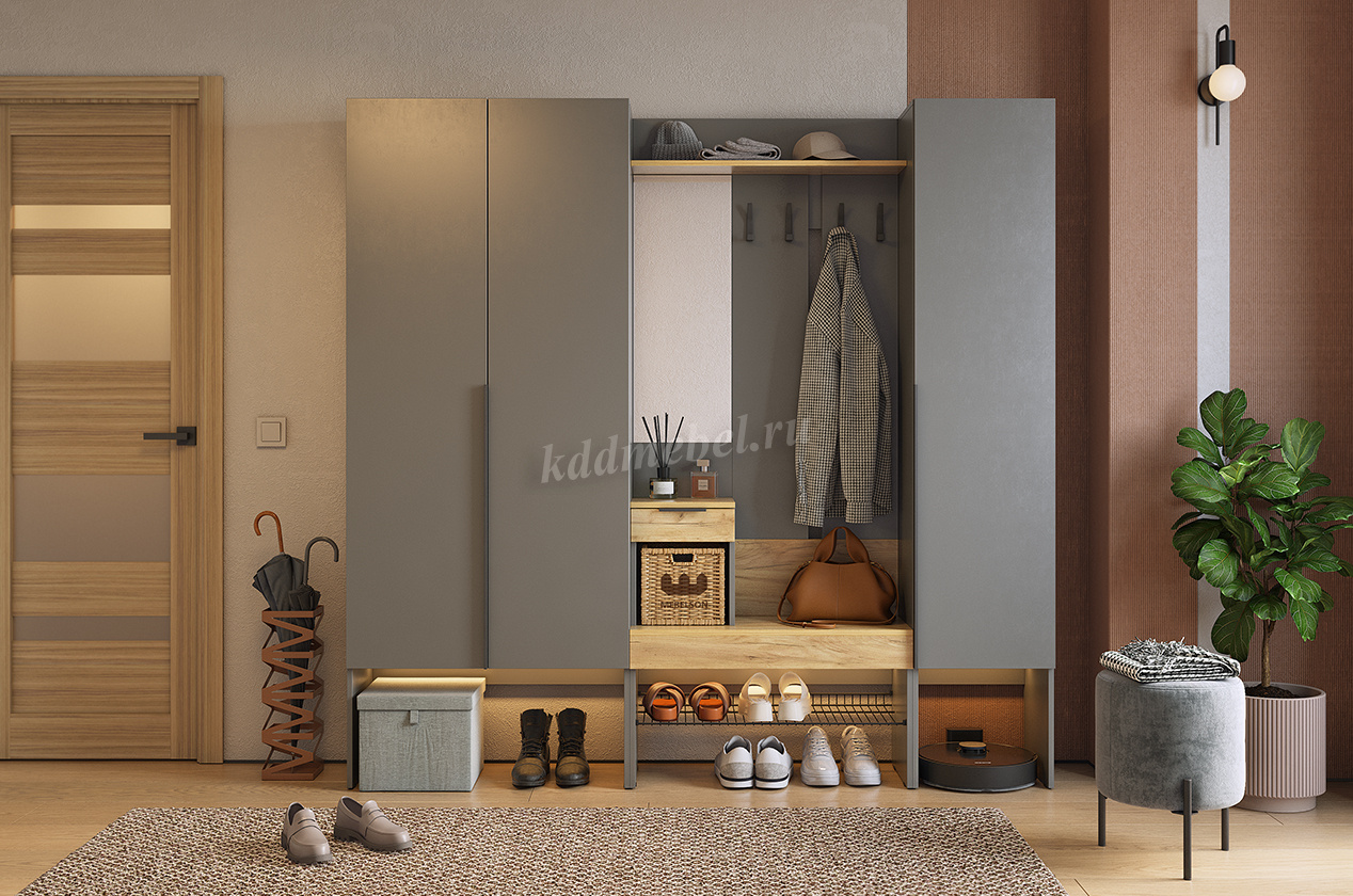 Шкаф оснащен накладными петлями с доводчиком от Боярд, которые обеспечивают плавное и бесшумное закрывание дверей. Выдвижная штанга и отделение с полками предоставляют удобный доступ к одежде, позволяя легко организовать внутреннее пространство.