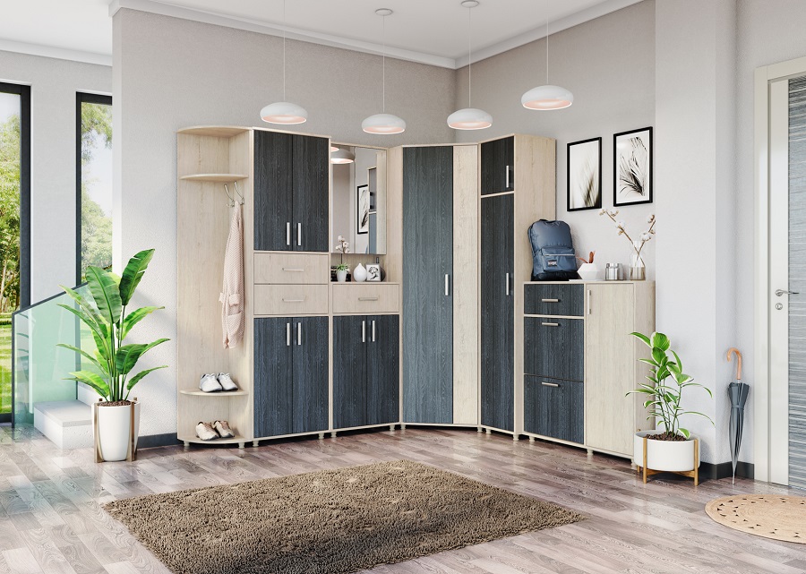 Из модулей, вошедших в комплектацию модульной прихожей «Граф» МФ Велес, можно собрать гарнитур любого типа – линейный, угловой, компактный или большой для входной группы дома. В любом случае комплект будет единым решением в конструктивном и стилистическом плане.