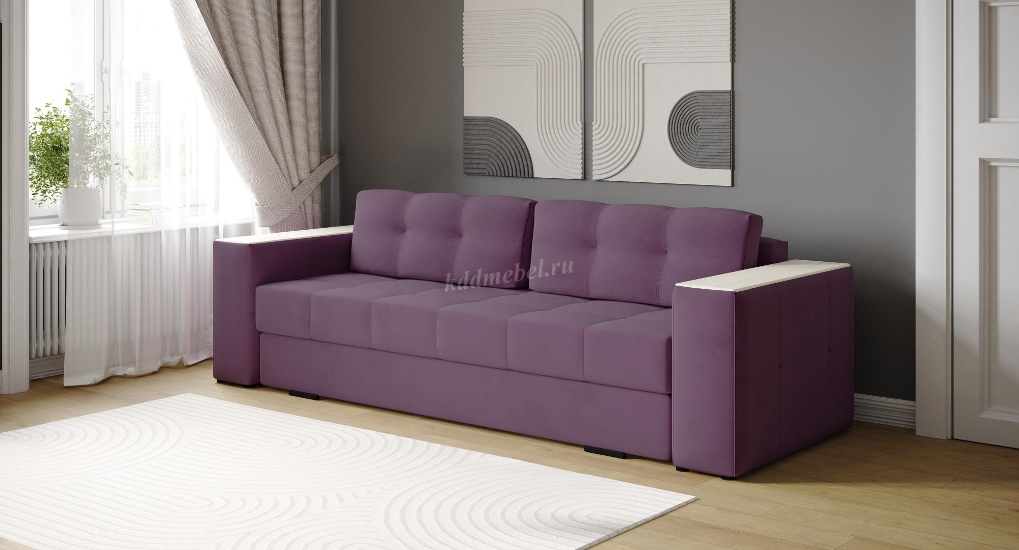 Механизм трансформации "Тик-так", благодаря которому диван превращается в полноценное спальное место с габаритами 2000х1470мм. Съемная подушка спинки, наполненная измельченным гипоаллергенным ППУ и простёганная двойной отделочной декоративной строчкой, обеспечивает максимальный комфорт во время отдыха. Вместительный ламинированный короб под сиденьем, для хранения постельных принадлежностей.